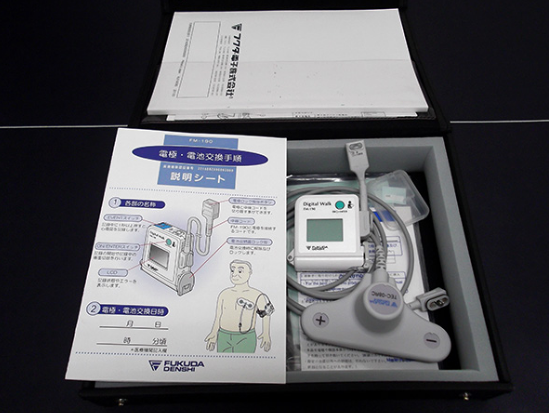 24時間患者様の心電図をモニターする装置です。おもに生活の中で不整脈が出るおそれのある方のデータを取る装置です。(貸出可)